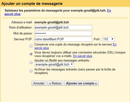 Ensuite, insérez les informations obtenues au début de ce tutoriel et précisez l’adresse et l’accès (ou le port) au serveur POP. Si votre hébergeur indique que vous devez vous connecter par SSL, cliquez sur la case « Vous devez toujours utiliser une connexion sécurisée (SSL) lorsque vous récupérez vos e-mails. »