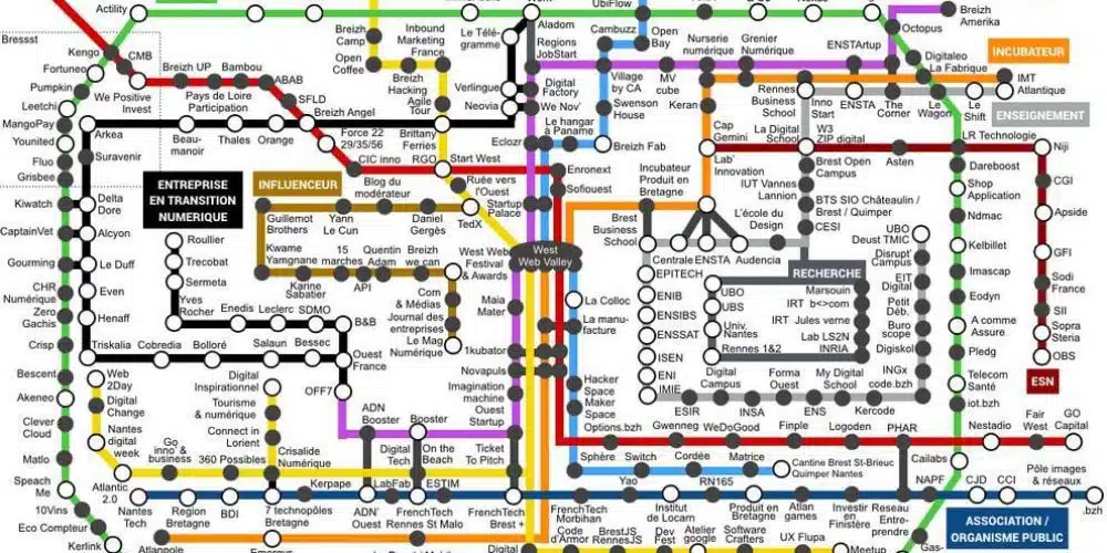 La West Web Valley propose son édition annuelle de la carte de l’écosystème numérique breton. Cette carte qui prend la forme d’un plan de métro rassemble les différents acteurs qui font la richesse de la Bretagne digitale. Le .bzh s’y intègre au titre des associations et des structures qui accompagnent les entrepreneurs et les acteurs du numérique en Bretagne. Une belle reconnaissance et une visibilité supplémentaire pour notre extension internet qui promeut un service de qualité internationale.